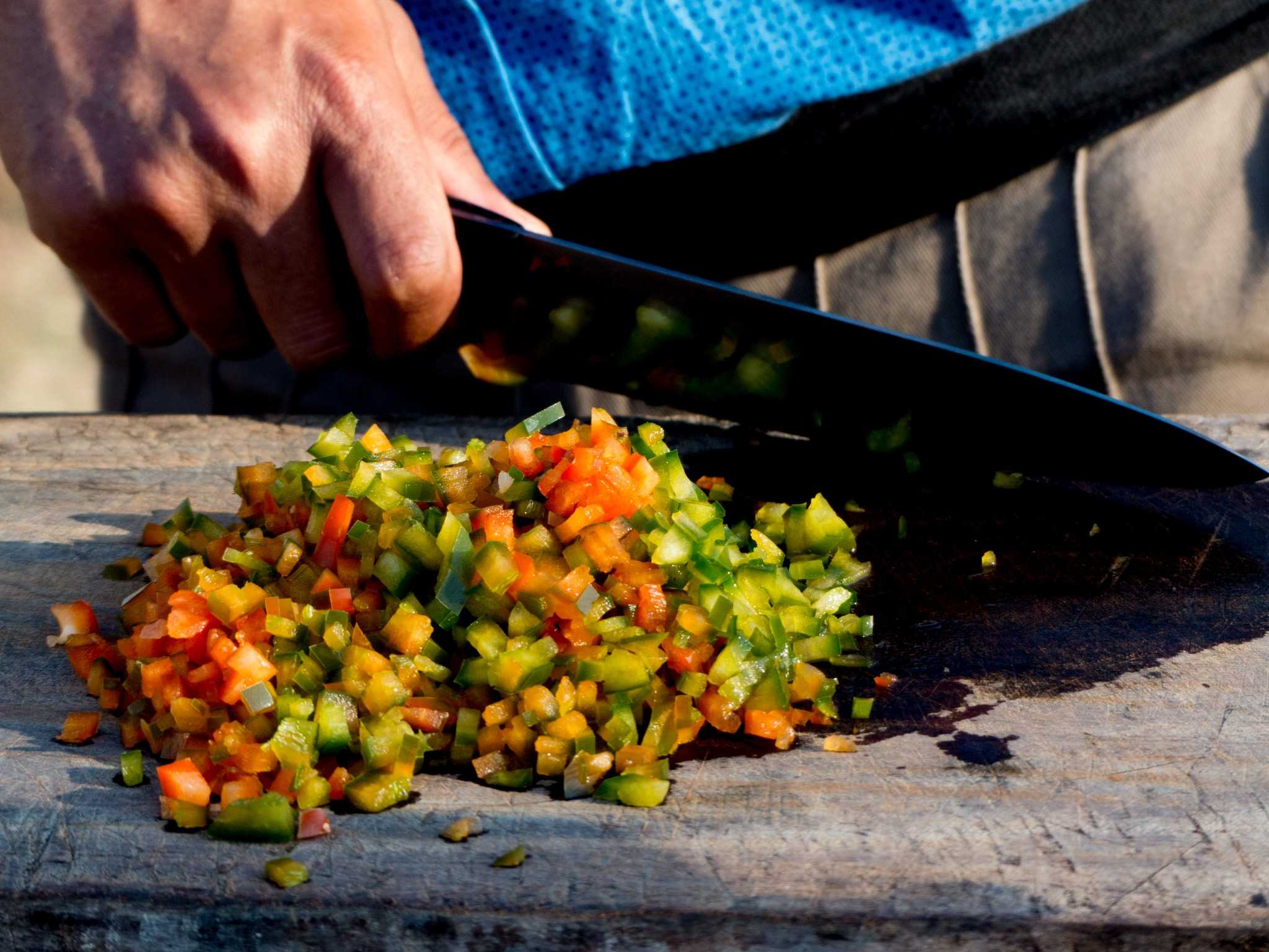 La forma de cortar las verduras también tiene su ciencia. El tomate, por ejemplo, se suele rallar para integrarse mejor en la mezcla y evitar pieles incómodas. La cebolla y el pimiento, en cambio, se cortan muy pequeños, casi como en brunoise, para que se fundan con el aceite y el resto de sabores.