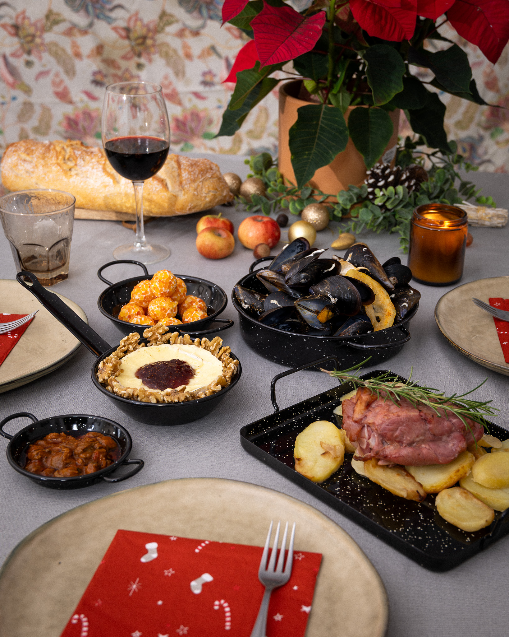 Las sartenes hondas con asas son un recurso fantástico para crear una mesa navideña visualmente rica y llena de pequeños detalles.